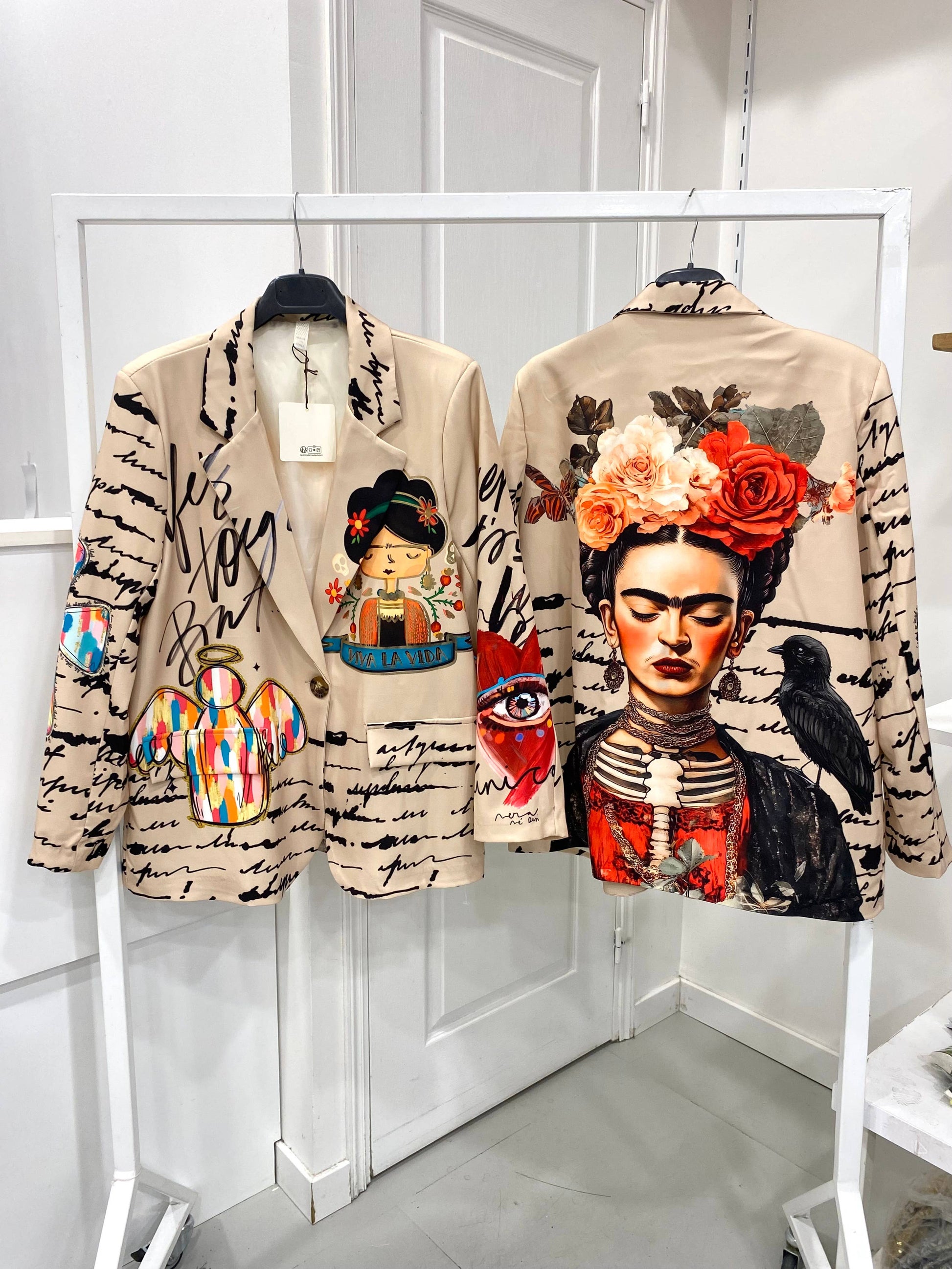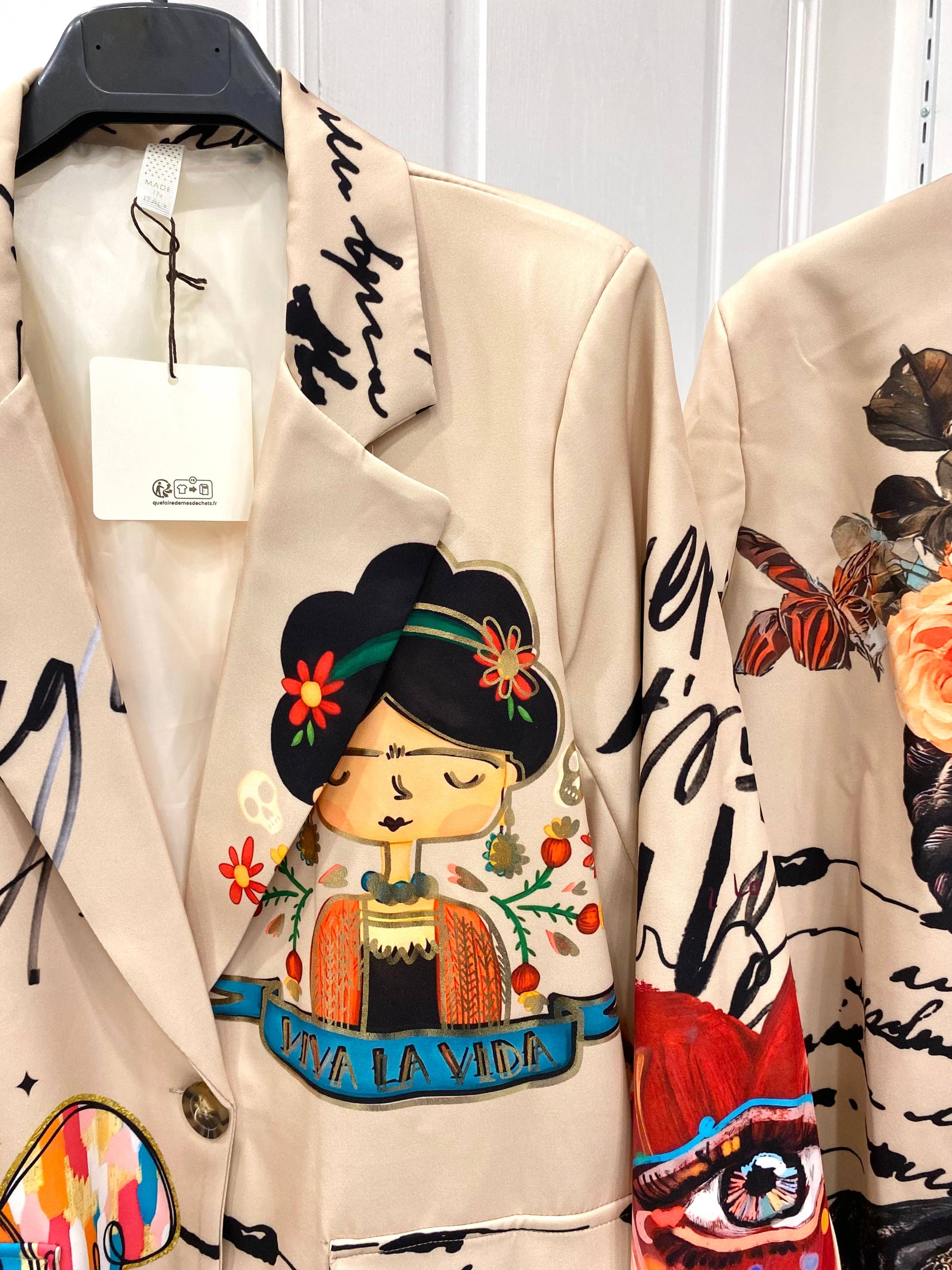 Konstnärligt mönstrad damkavaj, designad som ett starkt inslag i den moderna garderoben. Dess raka och flytande snitt anpassar sig till alla kroppstyper samtidigt som den erbjuder en bekväm och strukturerad passform. Tillverkad i ett lätt tyg, utmärker sig denna modell med tydliga visuella mönster: grafiska inspirationer, symboliska detaljer, etniska inslag eller blommiga accenter beroende på variationerna.