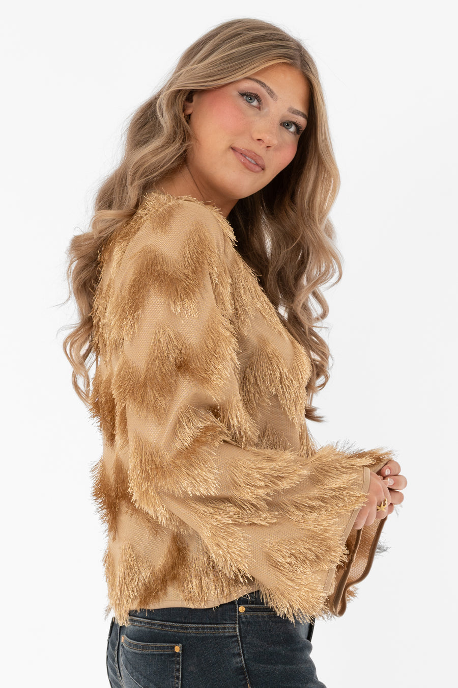 Trendiga tröja med fransar i zickzack mönster. Ledig passform med lätt utställda ärmar i fullängd.