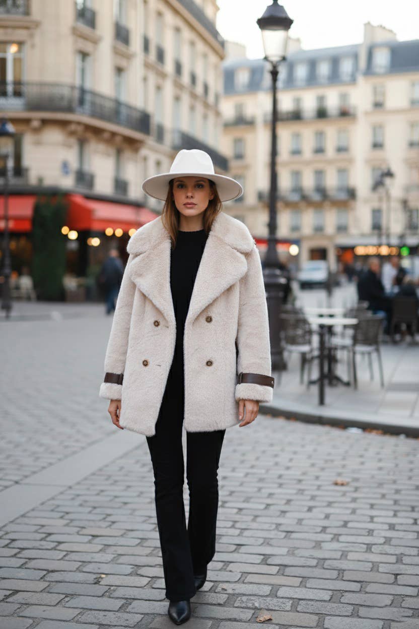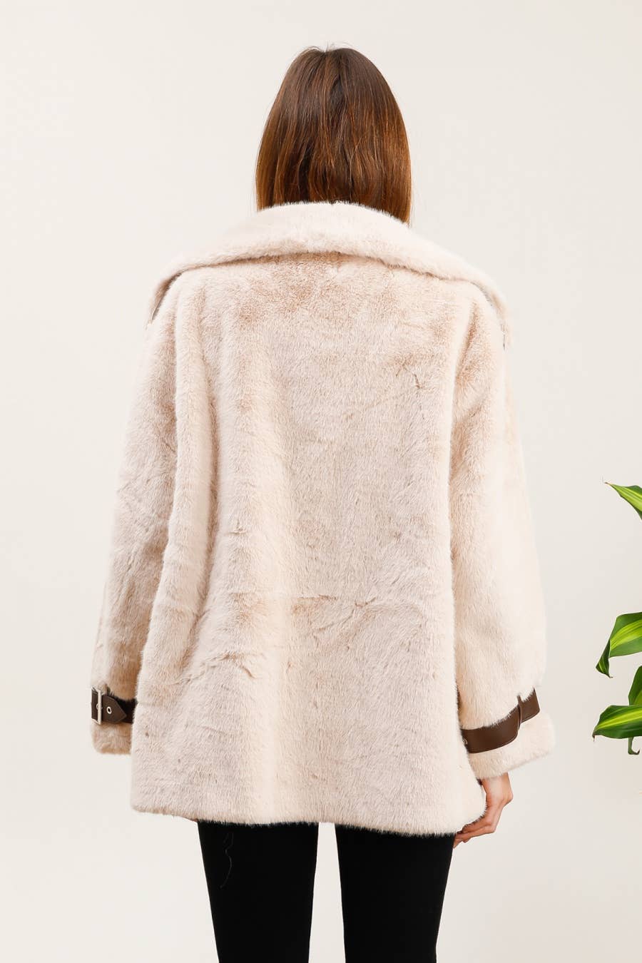 Välj en look som är både elegant och varm med denna fantastiska fuskpälsrock. Dess exceptionella nyans omsluter dig med komfort och stil för säsongen. Denna rock utmärker sig med sina moderna detaljer inspirerade av trenchcoats, inklusive dekorativa spännen på ärmarna och axelremmar, vilket ger en touch av originalitet. Dess raka och något lösa passform gör det enkelt att bära den över en tjock tröja. sammansättning 100% polyester