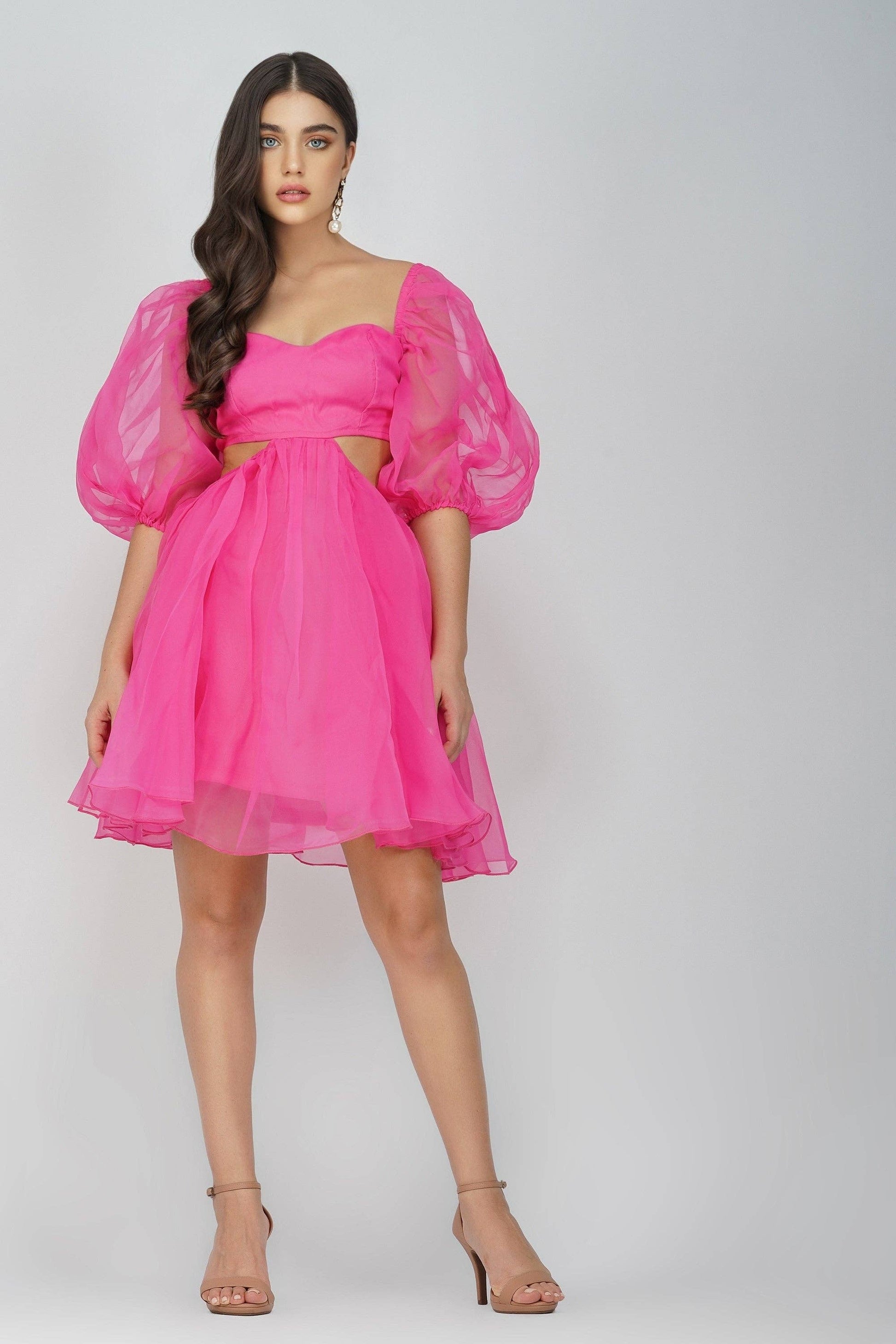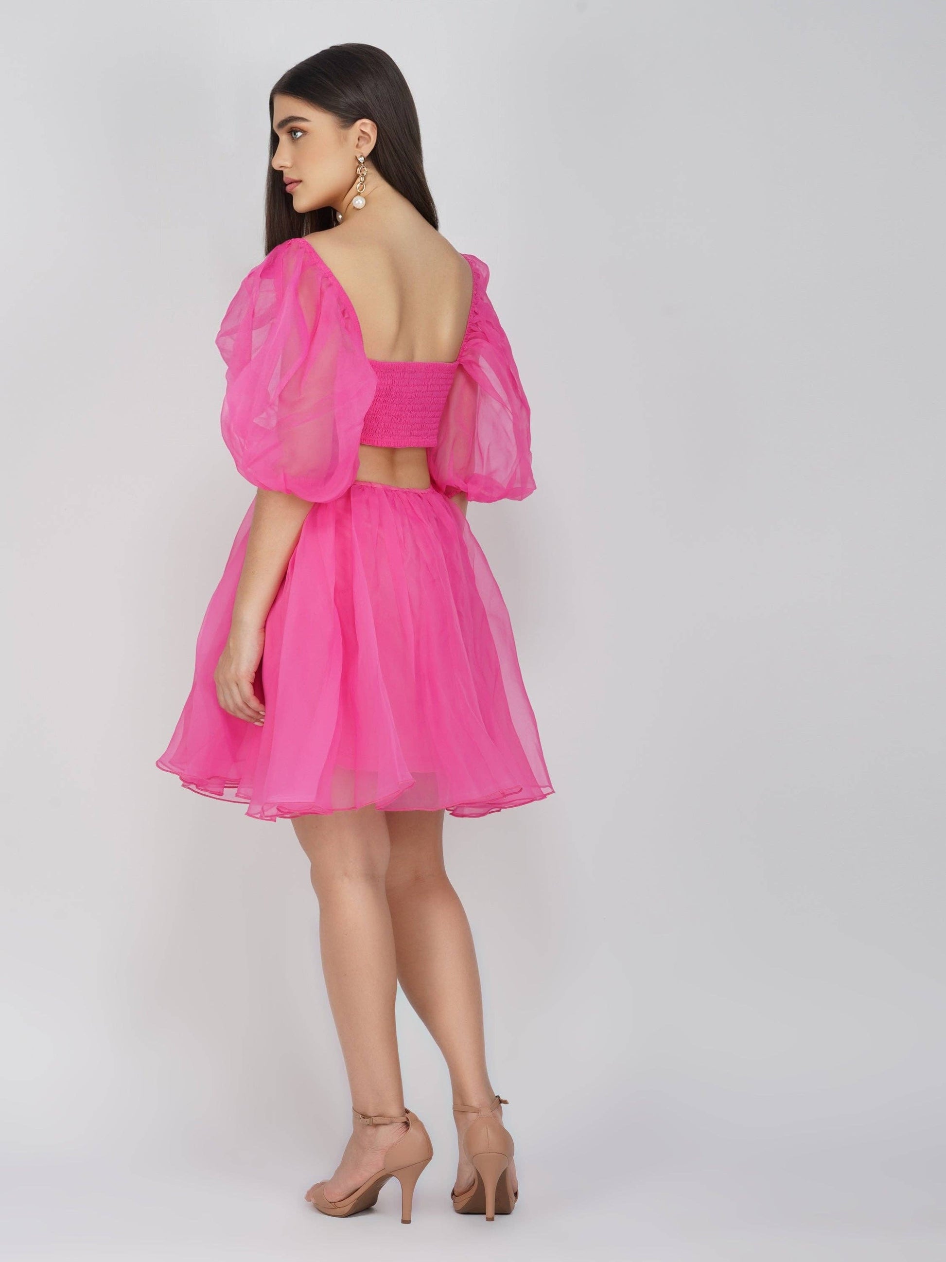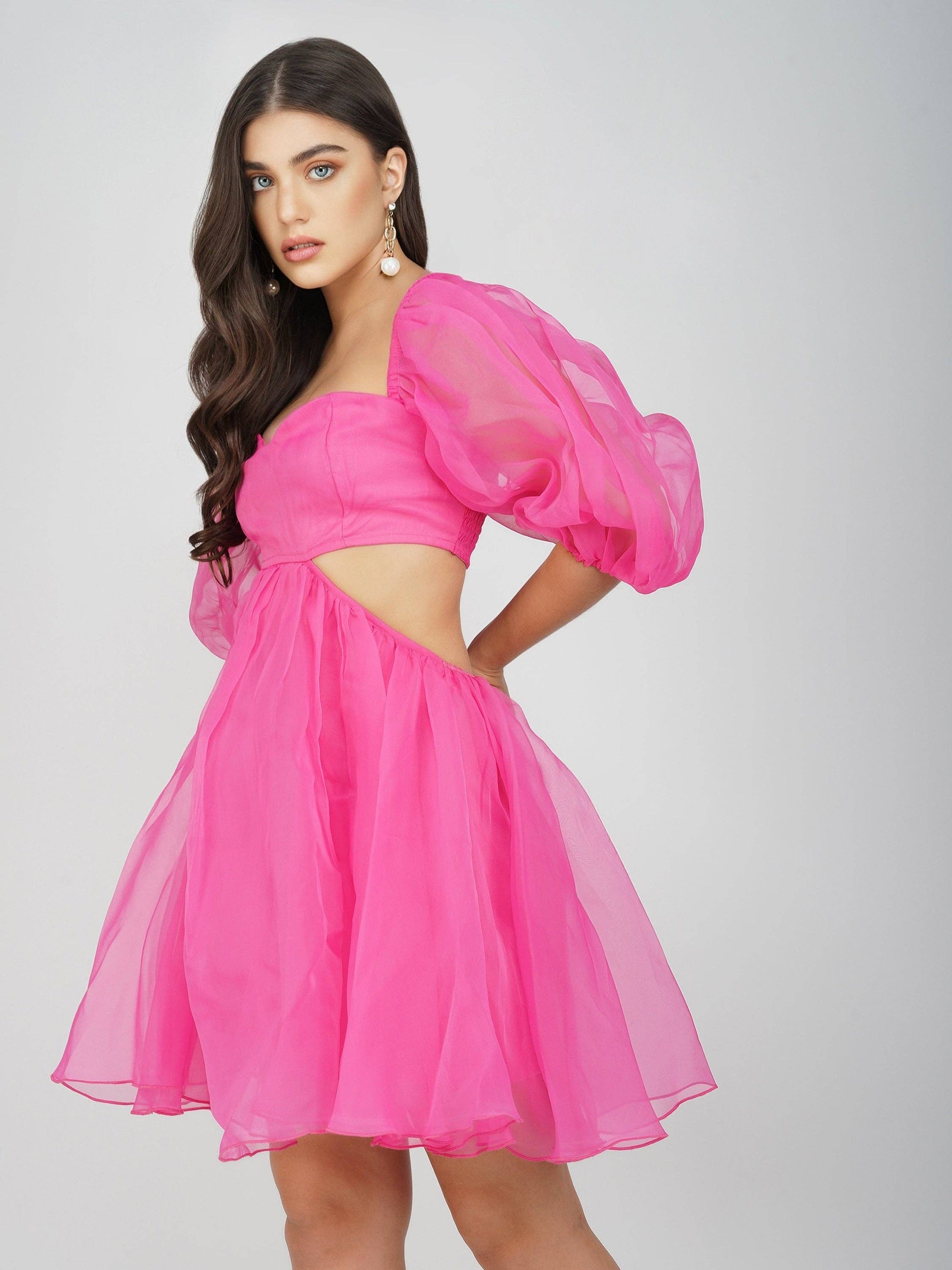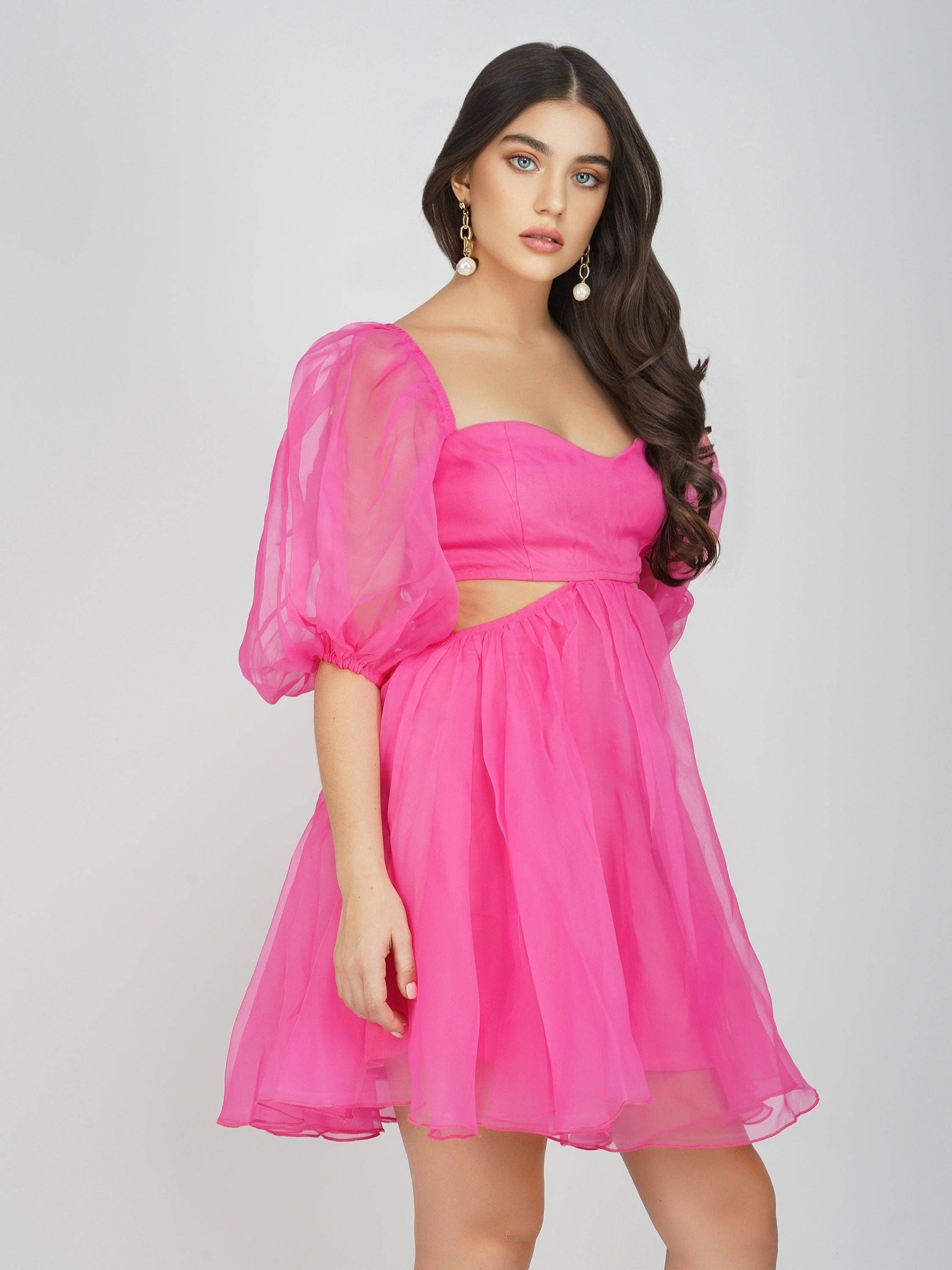 Tillverkad av mjukt organza-tyg, erbjuder den här klänningen en lätt och luftig känsla, vilket ger en bekymmerslös atmosfär. Den rynkade ryggen ger en avslappnad och smickrande passform. Den trendiga rosa nyansen i kombination med de underbara midjeutskärningarna gör den till den perfekta rosa festklänningen. Missa inte den här rosa miniklänningen.