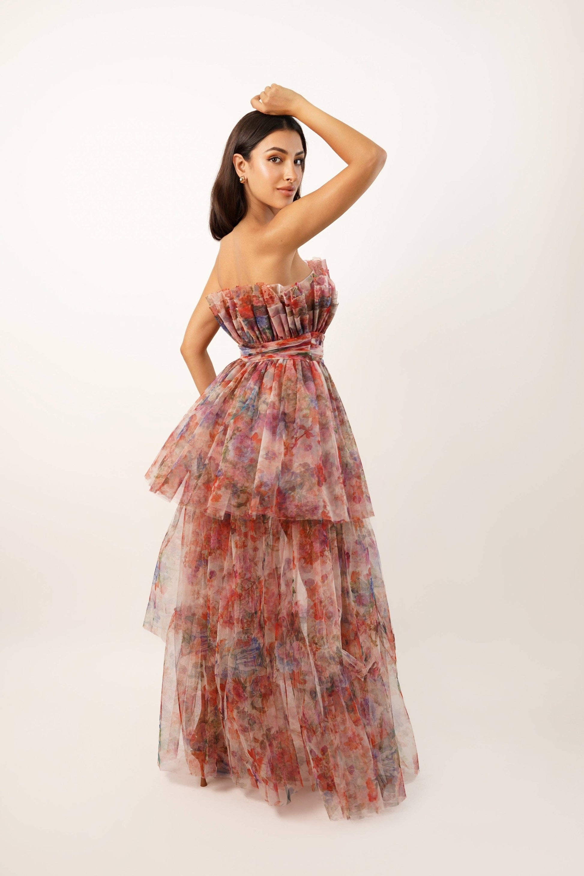 Tillverkad av högkvalitativ tyll, denna blommiga festklänning har en axelbandslös design som skapar en look som kommer att dra blickarna till sig vid varje tillfälle. Klänningen har en voluminös kjol som svänger utåt och en rynkad midja, vilket skapar en fantastisk silhuett. Lagren av tylltyg ger klänningen en känsla av lätthet och rörelse, vilket gör den perfekt för att dansa natten lång. Det blommiga mönstret bidrar till klänningens dramatik och gör den till ett absolut måste för din nästa tillställning.