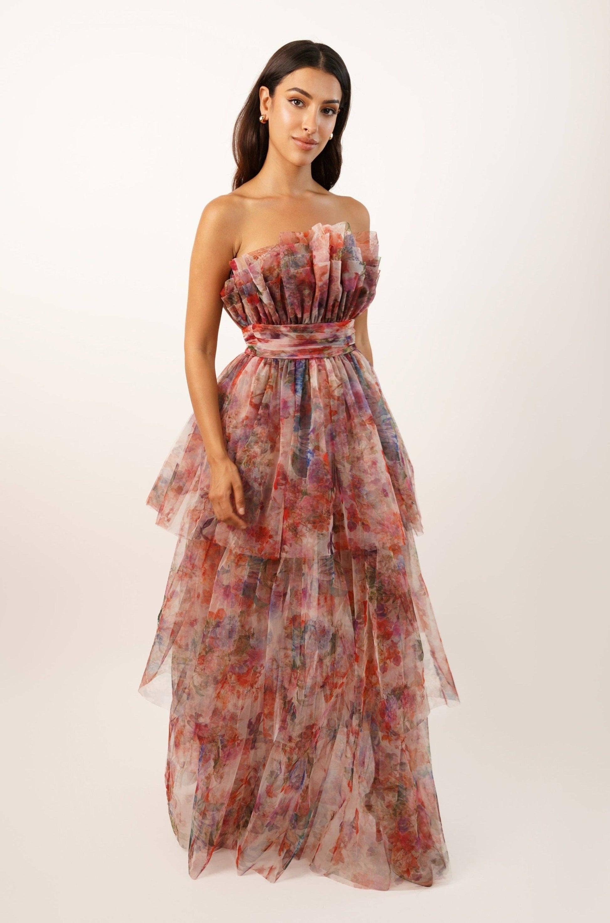 Lace & Beads Natalia blommig tyll maxiklänning. Denna blommiga statement-klänning har en voluminös och utsvängd liv, som utstrålar elegans och kvinnlighet i varje detalj.