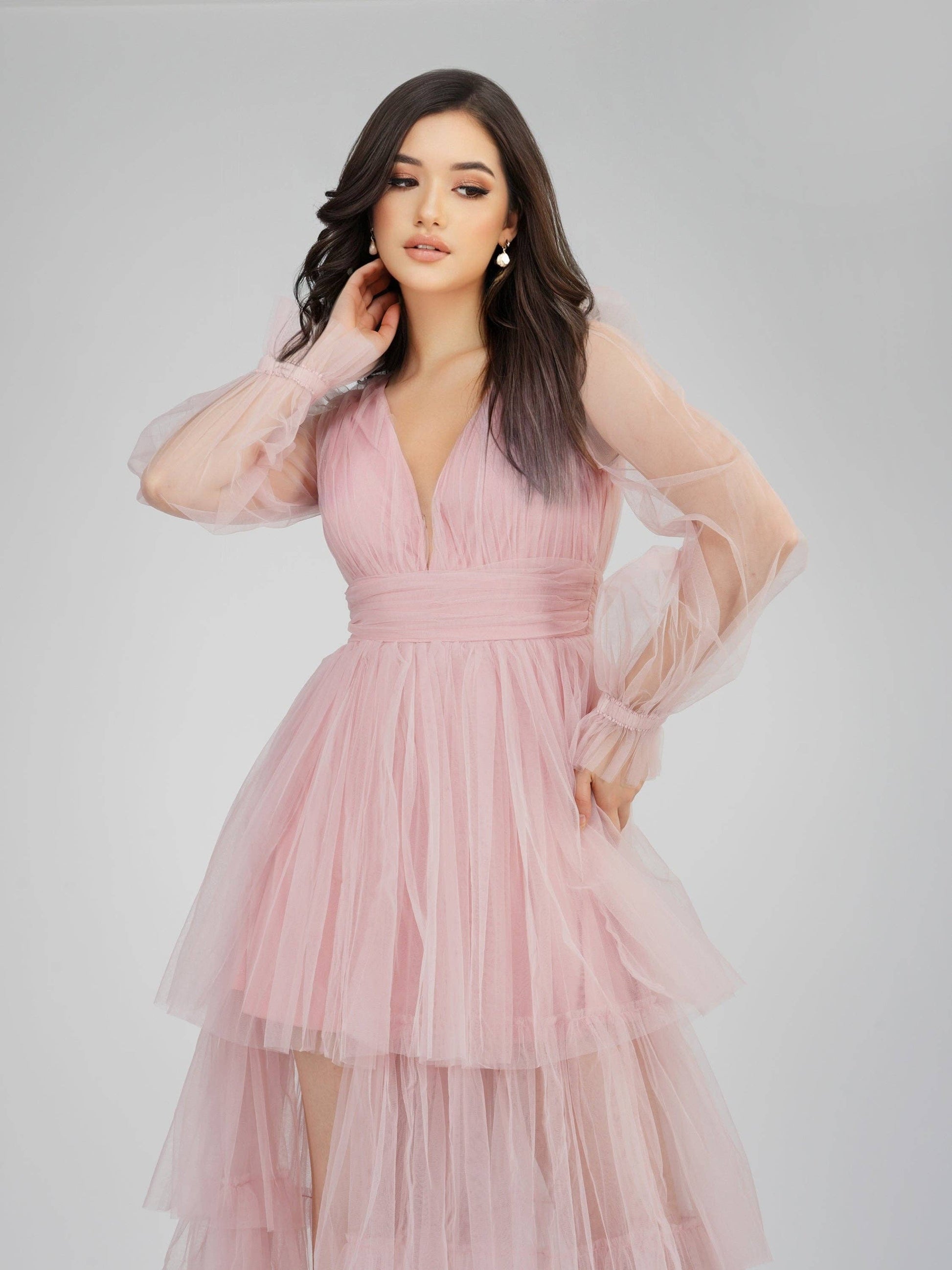 Den underbara rosa nyansen i kombination med den vackra tyllen ger ett förtrollat utseende. Den rynkade midjan ger en smickrande silhuett medan den hög-låga skiktade kjolen och den öppna ryggen lyfter utseendet.