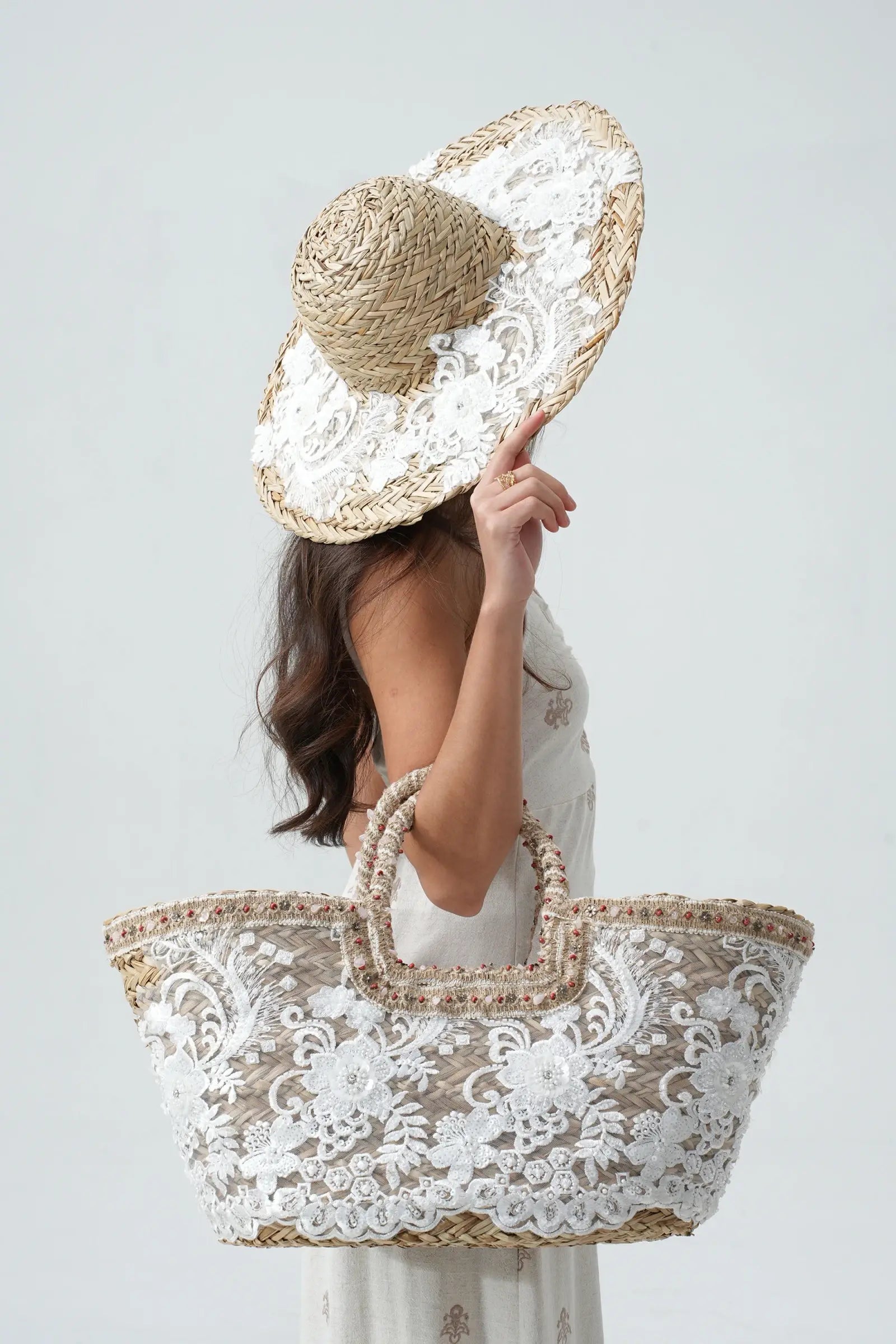 Lägg till en touch av mjukhet och romantik till dina sommaroutfits med denna stråhatt dekorerad med vit spets. Lätt, andningsbar och raffinerad, den förkroppsligar perfekt naturlig elegans. Perfekt för soliga dagar, lantliga picknickar eller bohemiska chica looks.