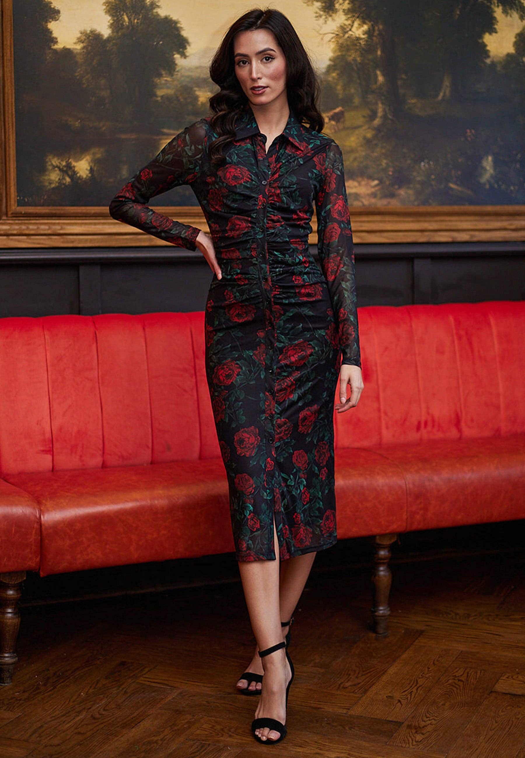 Rocka höstblommor i Bodycon-skjortklänningen med meshärmar i svart rosprint av ANGELEYE. Denna långärmade meshklänning med rynkdetaljer är designad för att smickra. Övergång i stil med detta underbara tryck i säsongens coolaste färg, röd. Kombinera med klackar för kvällsplaner eller klä ner för arbete.